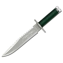 Master Cutlery RB1SS with a top grain leather sheath and COA with matching serial numberSylvester Stallone Signature Edition Knife measures 14" in overall length Individually serial numbered bladeTop quality 420 stainless steel bladeHollow handle with survival kitAluminum butt cap with precision compass, and a double screwdriver guardSlotted saw teeth Sawback spine Green cord wrapped handle ...